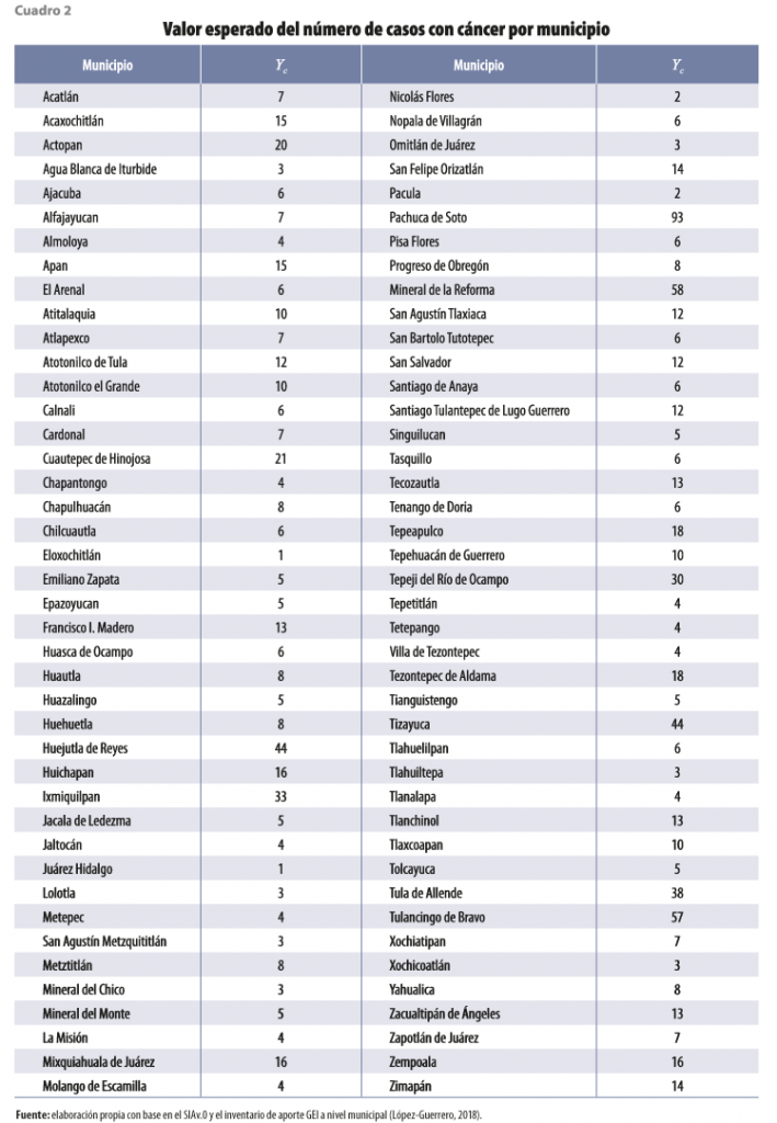 Adicionalmente, el estudio «Gases de efecto invernadero como elementos explicativos de los casos de cáncer en el estado de Hidalgo en 2015» realizado por la Universidad de Hidalgo (UAEH), estima las repercusiones que generan los gases de efecto invernadero sobre la salud de la población hidalguense a partir de un modelo probabilístico por cada municipio de la entidad.