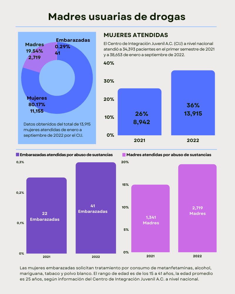 De acuerdo con datos del primer semestre de 2021 del CIJ, el 15% (1 341) de las pacientes atendidas por consumo de sustancias psicoactivas eran madres de familia; al tiempo de que asistieron a 22 mujeres embarazadas, lo que representa el 0.25%. No obstante, esto aumentó para el periodo de enero a septiembre de 2022, pues 19% (2 719) de las pacientes atendidas eran madres de familia y además 41, o sea 0.29%, eran mujeres embarazadas. Es decir, la demanda de atención a embarazadas incrementó 186%.